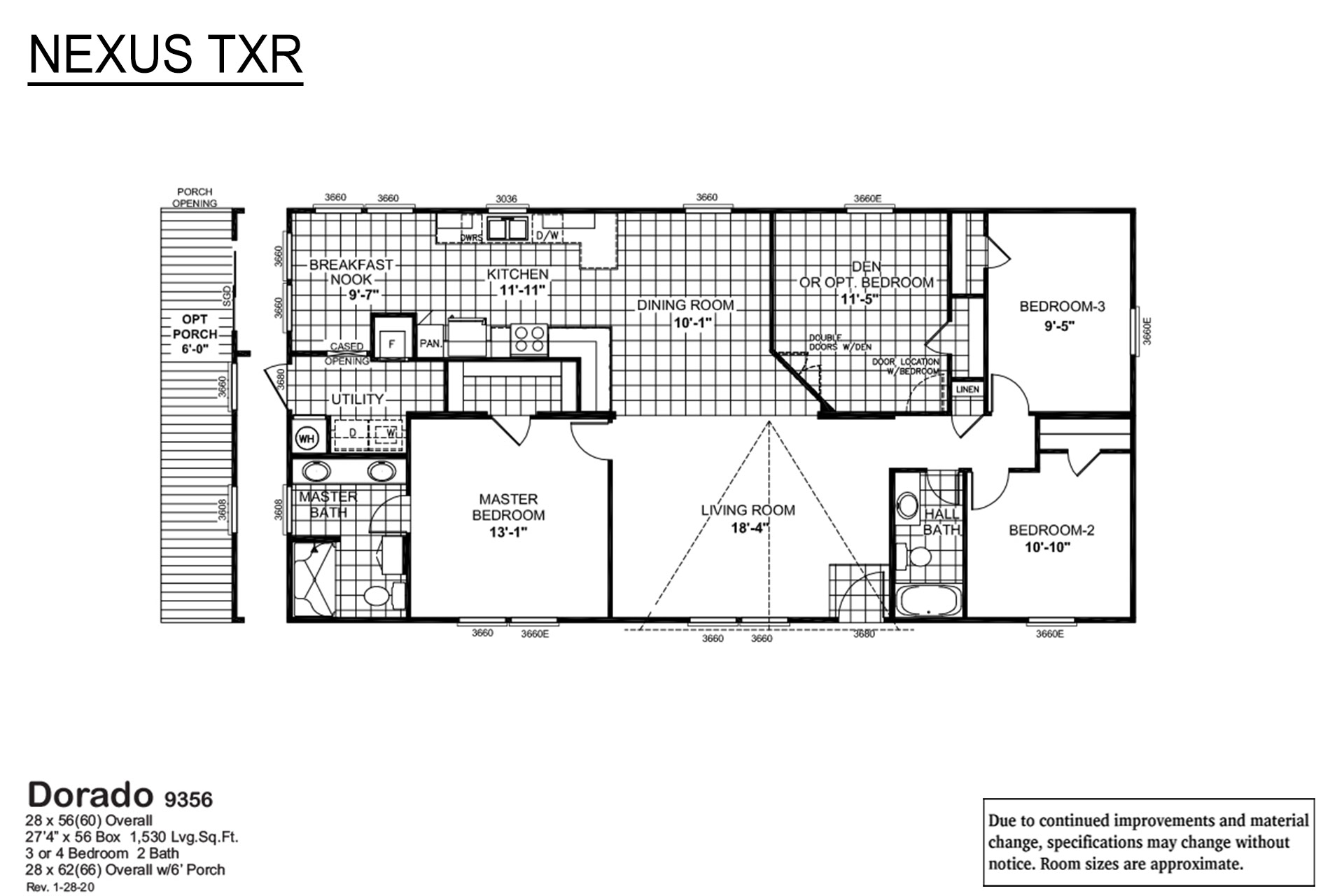 BEDS: 3 BATHS: 2 SQ FT: 1530 W X L: 28′ 0″ x 56′ 0″